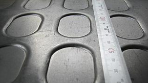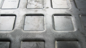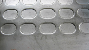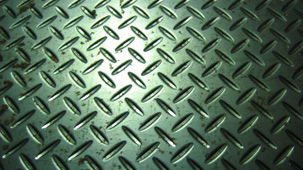 サンド鋼板は従来の縞鋼板に比べて、油等の付着時や水濡れ時の滑り止め性能が優れており、高い安全性が要求される用途の床材に適しています。