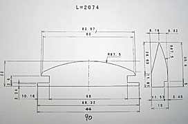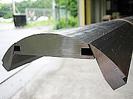 長さ2mのR加工品です。 中央にある本体の両サイドにRの目地が合体する事で、全体として87.5Rの円の一部を形成するように加工されています。 この製品はコンクリート製側溝を製造する為の、鋼製型枠の一部品として御使用して頂いております。