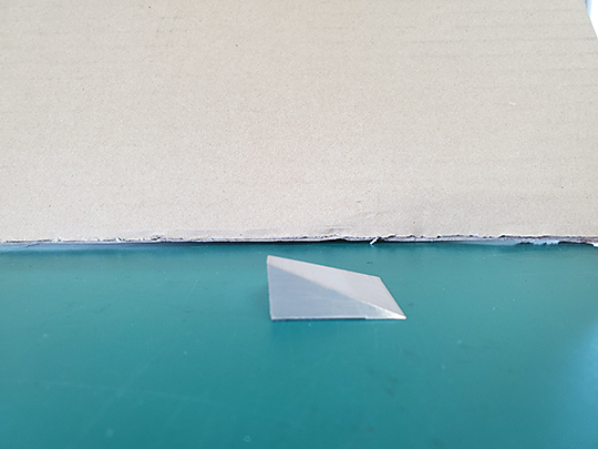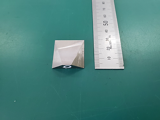 厚さ10mm、1辺わずか30mmという鉄の素材を4方向から斜めに削った商品です。元から非常に小さい上に、作業が進むと更に薄く掴みどころがなくなっていき、最後の面を削る時にはほとんど押さえられる部分がなくなってしまいます。この加工は熟練の職人でも難しく、段取りを試行錯誤して作り上げました。