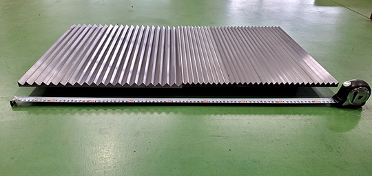 弊社では、ほうき目地など多数のV溝加工に携わってきましたが、これだけの深さがあるV溝加工を多数削り出す加工は、大変珍しいです。V溝加工の刃物は、刃先の摩耗が激しく、加工時間を要するだけでなく、刃物の研ぐタイミングなども良く考えて加工しなければなりません。切削中の音を良く聞きながら、タイミングを見計らいます。一歩間違えると、端から端まで、正確に揃えたV溝加工が出来なくなってしまうため、正確に削り出すためには注意をはらう必要がある加工品です。