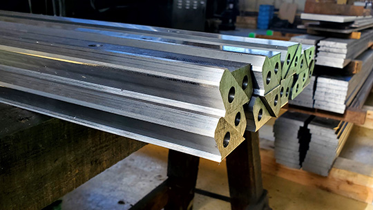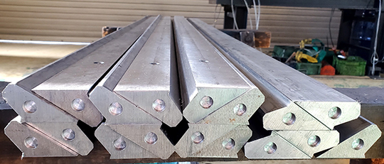 一部が切り抜かれたような「切り欠き」形状のコンクリートブロックを作るための目地棒です。型枠に固定するためのネジ穴が4箇所に開いており、両端に脱型用の叩き孔が開いているためコンクリート製造の効率アップに貢献できます。各部の寸法・角度共に厳密に指定されている、全てにおいて加工難度の高い製品で、抜き勾配を正確に削ることと、ネジ穴が目地棒を貫通してしまわないように加工することが特に大変だったとのことです。